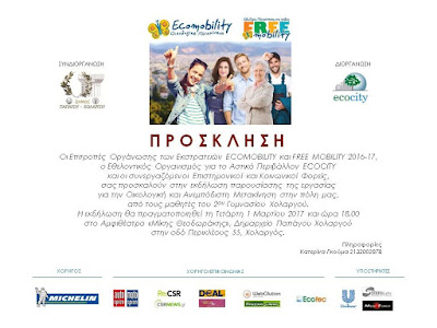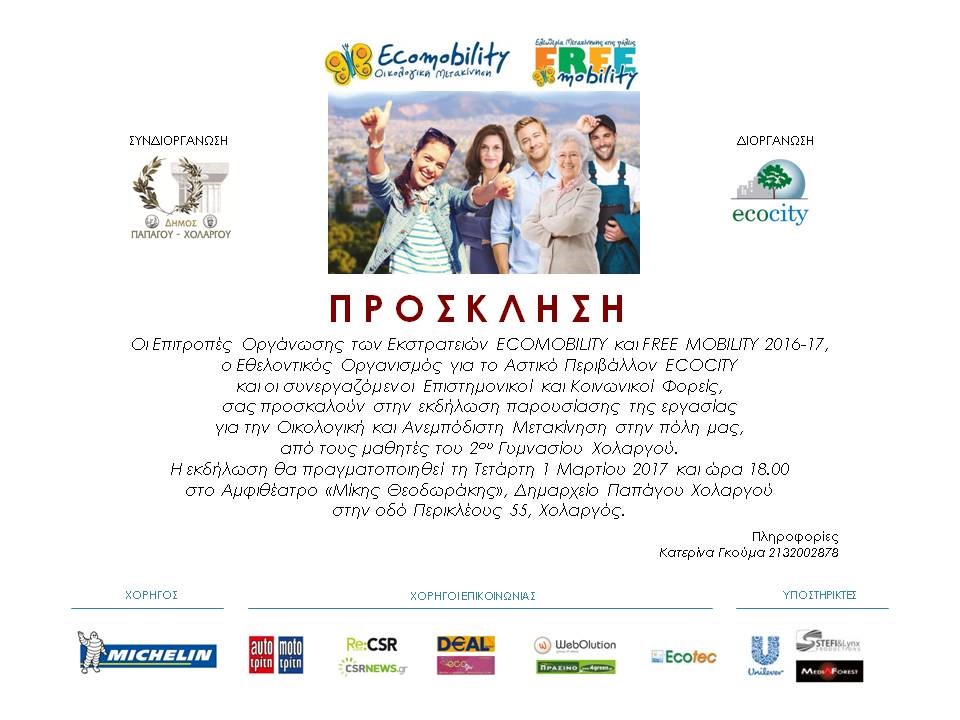 Με σύνθημα «Οι μαθητές ερευνούν, οι πόλεις ενημερώνονται και η κοινωνία ευαισθητοποιείται», ομάδα μαθητών του 2ου Γυμνασίου Χολαργούσυμμετέχει στην εκστρατεία «Ecomobility2016-2017». Την Τετάρτη 1 Μαρτίου, στις 18:00, οι μαθητές θα παρουσιάσουν την εργασία τους για την οικολογική και ανεμπόδιστη μετακίνηση, στο