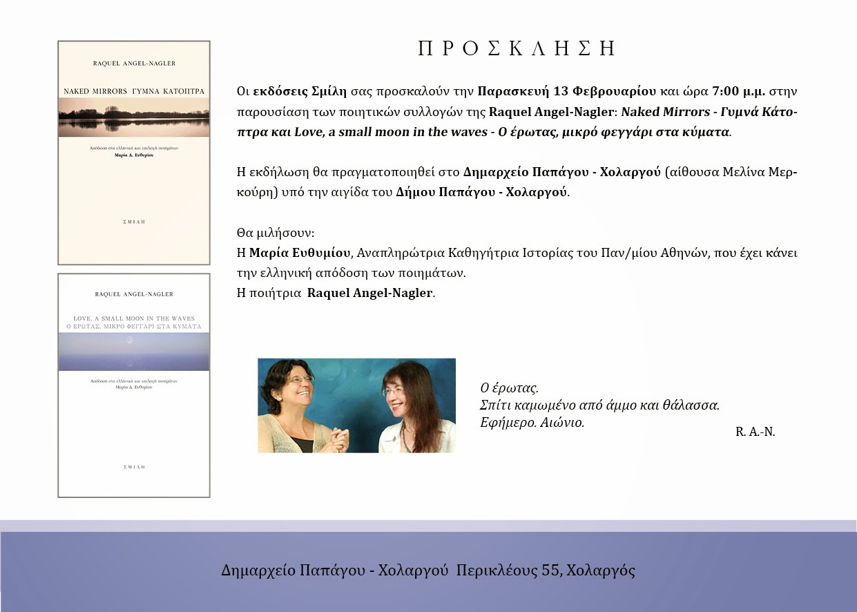 Τις ποιητικές συλλογές της Raquel Angel–Nagler, «Naked Mirrors – Γυμνά Κάτοπτρα» και «Love, a small moon in the waves – Ο έρωτας, μικρό φεγγάρι στα κύματα», παρουσιάζουν αύριο Παρασκευή, 13/2, στην αίθουσα «Μελίνα Μερκούρη» του Δημαρχιακού Μεγάρου Χολαργού, οι εκδόσεις «Σμίλη». Για τις ποιητικές αυτές