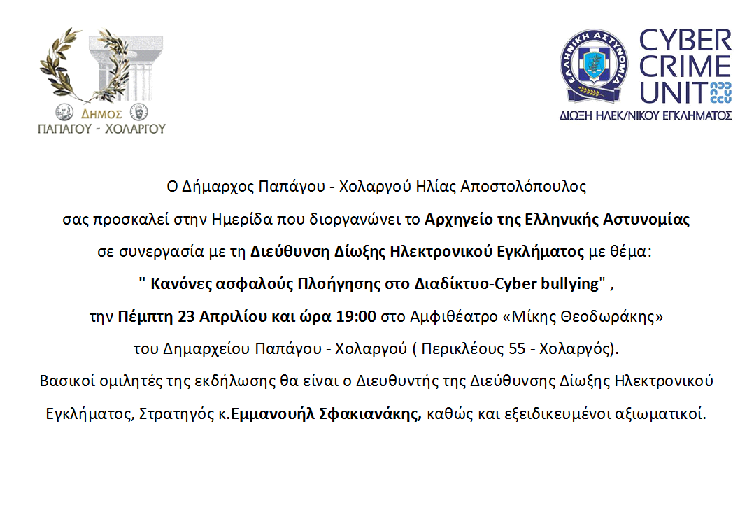 Αστυνομίας, σε συνεργασία με τη Διεύθυνση Δίωξης Ηλεκτρονικού Εγκλήματος, με θέμα: «Κανόνες ασφαλούς πλοήγησης στο διαδίκτυο – Cyberbullying». Η εκδήλωση θα λάβει χώρα στο αμφιθέατρο «Μίκης Θεοδωράκης» του Δημαρχιακού Μεγάρου Χολαργού, με ώρα έναρξης στις 7.00 το απόγευμα. Πέραν του Στρατηγού, κ. Σφακιανάκη, στην ημερίδα θα μιλήσουν και άλλοι εξειδικευμένοι αξιωματικοί της Ελληνικής Αστυνομίας.