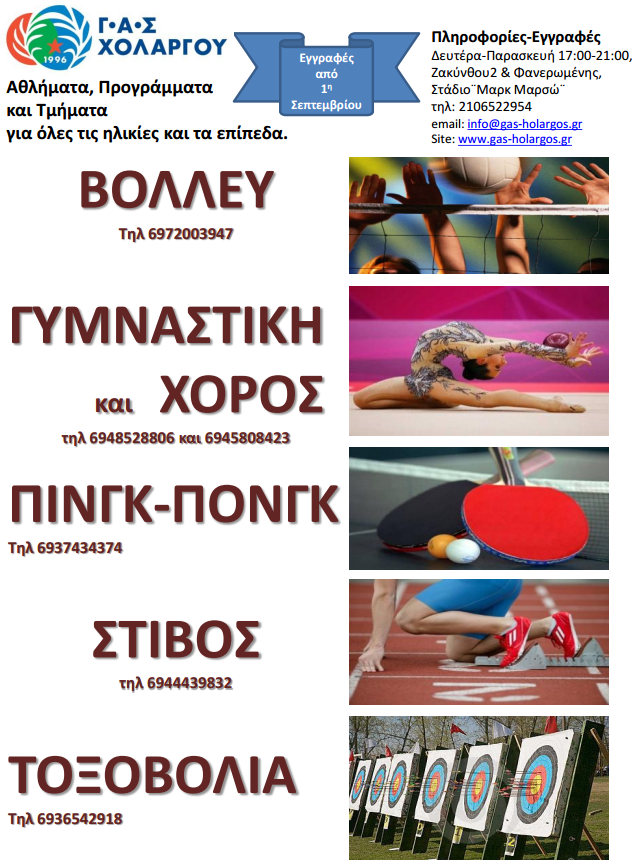 Τη διαφημιστική αφίσα της νέας αθλητικής αγωνιστικής περιόδου (2015-2016) έδωσε στη δημοσιότητα τη Δευτέρα (31/8) ο Γυμναστικός Αθλητικός Σύλλογος Χολαργού. Αθλήματα, προγράμματα και τμήματα για όλες τις ηλικίες και τα επίπεδα θα περιμένουν για μία ακόμη χρονιά τους ενδιαφερόμενους, Χολαργιώτες και μη, σε έναν από τους πιο πετυχημένους και παραγωγικούς αθλητικούς συλλόγους πανελληνίως. Οι εγγραφές σε βόλεϊ, στίβο, γυμναστική & χορό, τοξοβολία και πινγκ πονγκ ανοίγουν από την Τρίτη 1 Σεπτεμβρίου και θα πραγματοποιούνται όλες τις καθημερινές, από τις 5.00 το απόγευμα έως τις 9.00 το βράδυ, στα