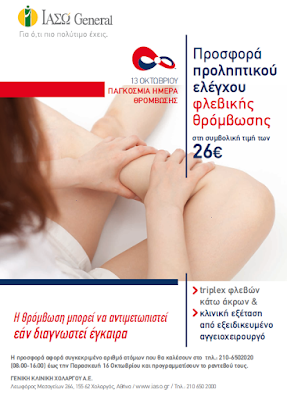 Με αφορμή την Παγκόσμια Ημέρα Θρόμβωσης (13/10), το ΙΑΣΩ General, πιστό στην προσπάθειά του για ευαισθητοποίηση και ενημέρωση του κοινού σχετικά με την αξία της πρόληψης, προσφέρει triplex φλεβών κάτω άκρων και κλινική εξέταση από εξειδικευμένους αγγειοχειρουργούς στη συμβολική τιμή των 26 ευρώ. Οι ενδιαφερόμενοι μπορούν να επικοινωνήσουν στο τηλ. 2106502020 έως και την Παρασκευή 16 Οκτωβρίου (08:00-16:00) και να προγραμματίσουν το ραντεβού τους. Σημειώνεται ότι η προσφορά αφορά συγκεκριμένο αριθμό ατόμων και θα τηρηθεί σειρά προτεραιότητας. Ο ανωτέρω έλεγχος συμβάλλει στην έγκαιρη διάγνωση και κατά