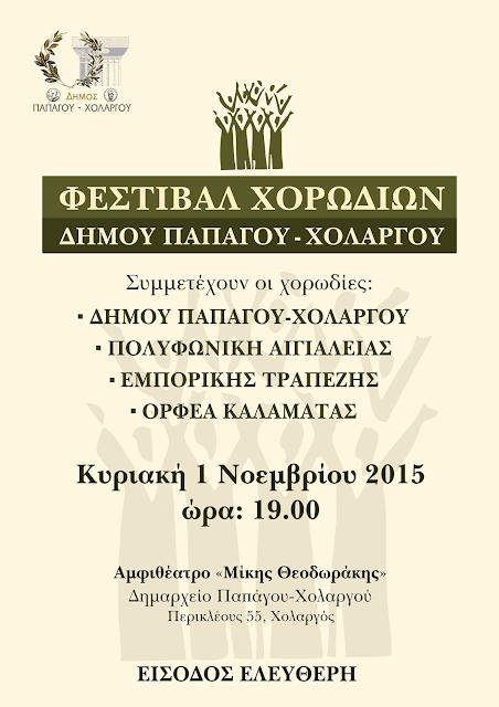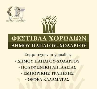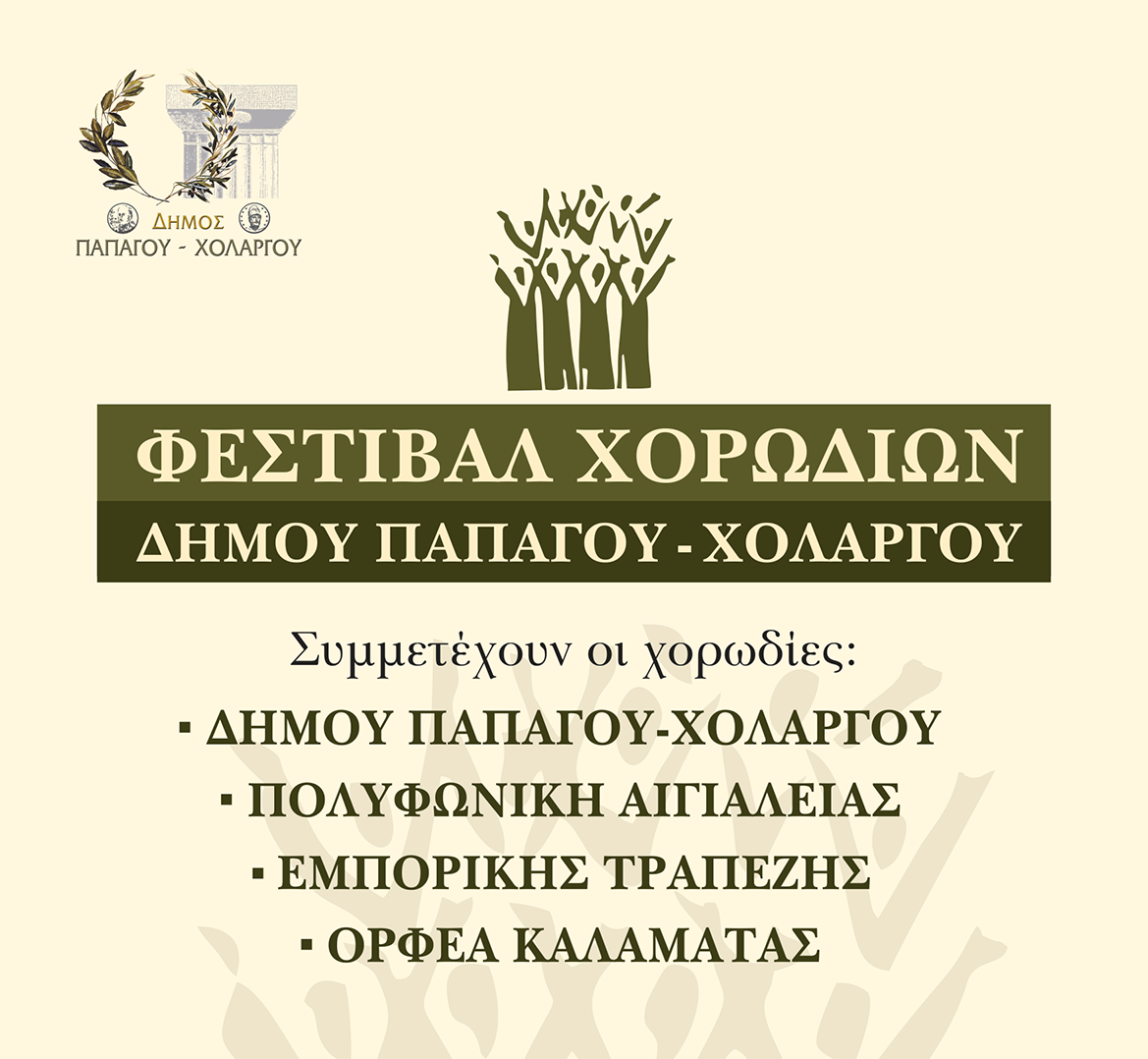 Με τη συμμετοχή της Χορωδίας του Δήμου Παπάγου – Χολαργού, της Πολυφωνικής Χορωδίας Αιγιαλείας, της Χορωδίας της Εμπορικής Τραπέζης και της Χορωδίας του Ορφέα Καλαμάτας θα πραγματοποιηθεί την Κυριακή 1 Νοεμβρίου το 4ο Φεστιβάλ Χορωδιών του Δήμου Παπάγου – Χολαργού. Η εκδήλωση θα λάβει χώρα στο αμφιθέατρο «Μίκης Θεοδωράκης» του Δημαρχιακού Μεγάρου