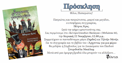 Την παρουσίαση του βιβλίου «Άρχοντας για μια μέρα», του Πέτρου Κρις, πραγματοποιούν την Κυριακή 22 Νοεμβρίου οι εκδόσεις «Φίλντισι». Ο εκδοτικός οίκος που εδρεύει στη Δημοτική Κοινότητα Παπάγου θα περιμένει μικρούς
