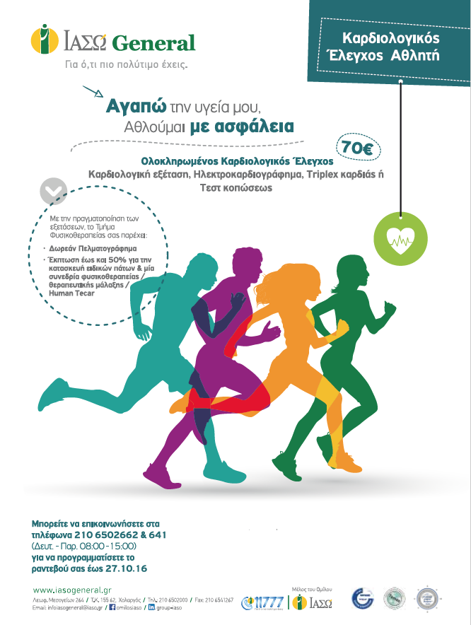 Το ΙΑΣΩ General είναι δίπλα σε κάθε αθλητή που αγαπά την υγεία του και αθλείται με ασφάλεια, προσφέροντας ολοκληρωμένο καρδιολογικό έλεγχο στην προνομιακή τιμή των 70€. Ο έλεγχος περιλαμβάνει Δωρεάν Καρδιολογική εξέταση με Ηλεκτροκαρδιογράφημα και Τriplex καρδιάς ή Tεστ κοπώσεως (ανάλογα με το αποτέλεσμα της καρδιολογικής εξέτασης, την ηλικία και το ιστορικό του ενδιαφερόμενου). Επιπρόσθετα, σε όσους πραγματοποιήσουν τις ανωτέρω εξετάσεις, παρέχεται από το Τμήμα Φυσικοθεραπείας της Κλινικής Δωρεάν πελματογράφημα και έκπτωση έως και 50% για την κατασκευή ειδικών ορθωτικών πάτων και μία συνεδρία