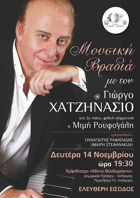 Μουσική βραδιά με το Γιώργο Χατζηνάσιο διοργανώνει το βράδυ της Δευτέρας (14/11) ο Δήμος Παπάγου-Χολαργού. Τον κορυφαίο μουσικοσυνθέτη θα πλαισιώσουν στο πιάνο η Αντιδήμαρχος Πολιτισμού, Εθιμοτυπίας, Δημοσίων & Διεθνών Σχέσεων Παπάγου-Χολαργού, Μιμή Ρουφογάλη και στο τραγούδι ο Παναγιώτης Ραφαηλίδης και η Μαίρη Στεφανακίδη. Η εκδήλωση θα πραγματοποιηθεί στο