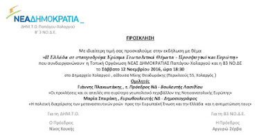 Εκδήλωση με θέμα «Η Ελλάδα σε σταυροδρόμι: Κρίσιμα Γεωπολιτικά Θέματα – Προσφυγικό και Ευρώπη» συνδιοργανώνουν το Σάββατο (12/11) η Τοπική Οργάνωση Νέας Δημοκρατίας Παπάγου-Χολαργού και η Β3 Νομαρχιακή Διοικούσα Επιτροπή. Ομιλητές