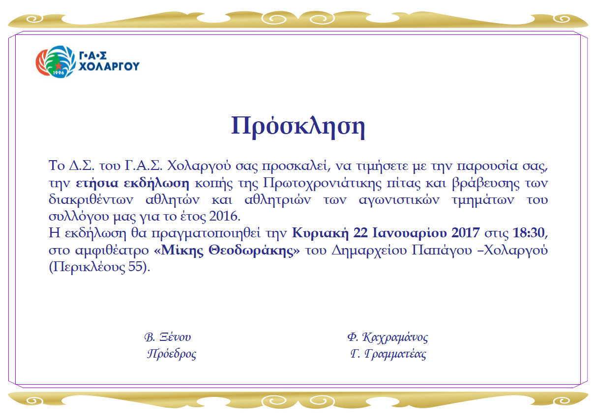 Το Διοικητικό Συμβούλιο του Γυμναστικού Αθλητικού Συλλόγου Χολαργού σάς προσκαλεί να τιμήσετε με την παρουσία σας την ετήσια εκδήλωση κοπής της πρωτοχρονιάτικης πίτας και βράβευσης των διακριθέντων αθλητών και αθλητριών των