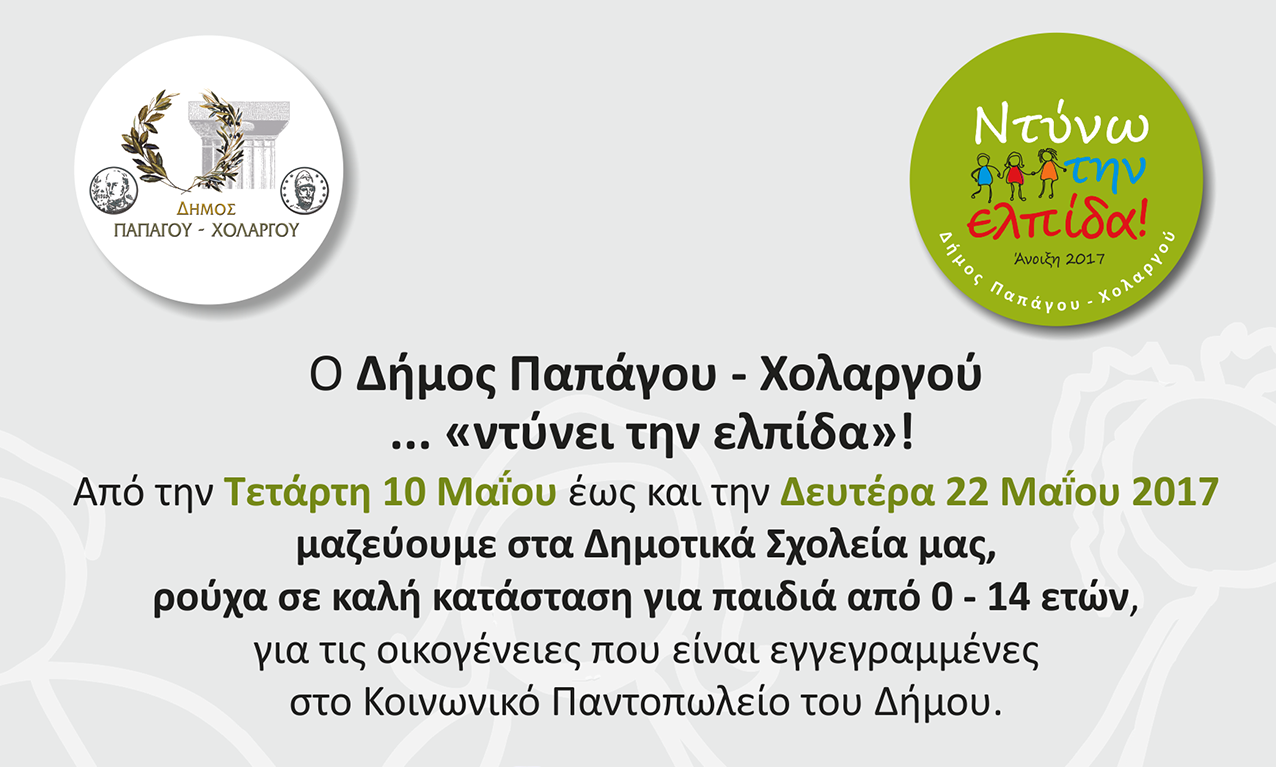 Ο Δήμος Παπάγου-Χολαργού, σε συνεργασία με Συλλόγους Γονέων και Κηδεμόνων, συγκεντρώνει ρούχα για παιδιά έως 14 ετών, για τις οικογένειες που είναι εγγεγραμμένες στο Κοινωνικό Παντοπωλείο του Δήμου. Τα ρούχα θα συγκεντρώνονται έως και τη Δευτέρα 22 Μαΐου 2017 στα