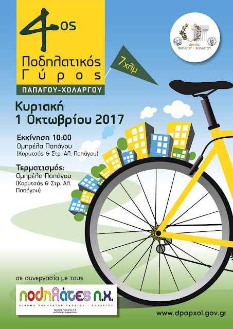 Ο Δήμος Παπάγου-Χολαργού, σε συνεργασία με τους Ποδηλάτες Παπάγου-Χολαργού, διοργανώνει τον 4ο Ποδηλατικό Γύρο για παιδιά και ενήλικες, την Κυριακή 1 Οκτωβρίου 2017.
