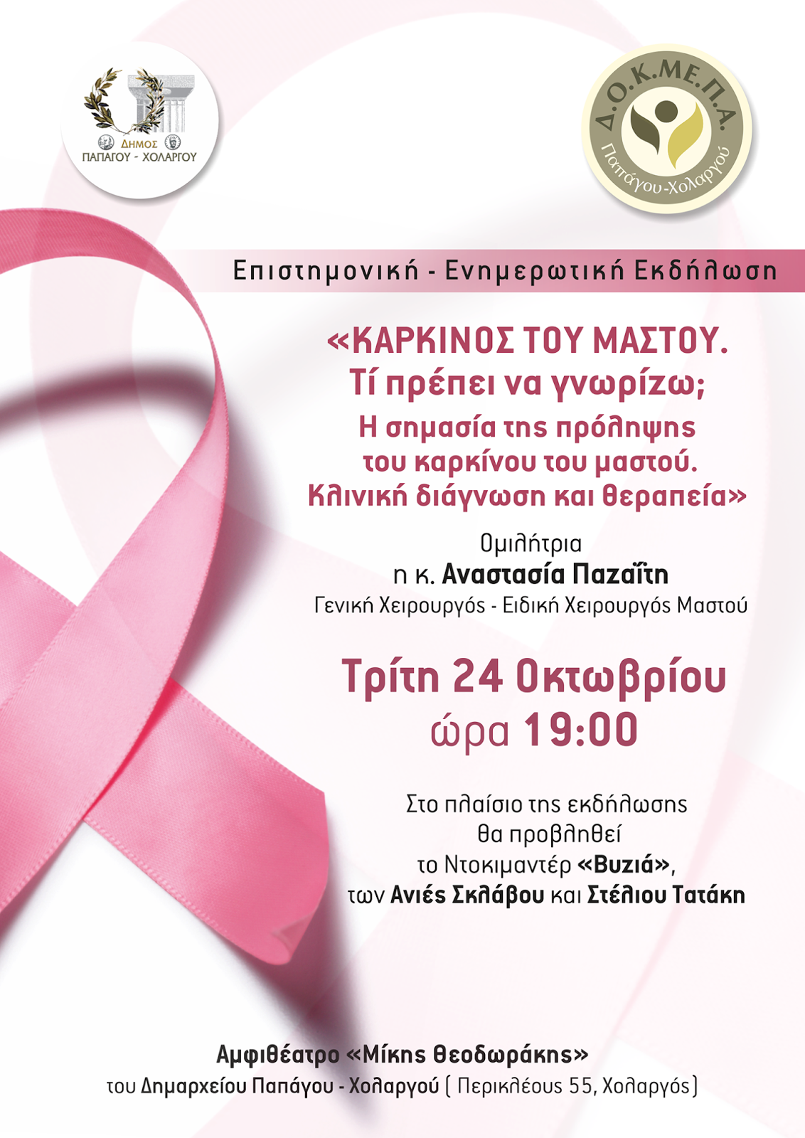 Ο Δήμαρχος Παπάγου-Χολαργού, Ηλίας Αποστολόπουλος και η Πρόεδρος του Δημοτικού Οργανισμού Κοινωνικής Μέριμνας & Προσχολικής Αγωγής (ΔΟΚΜΕΠΑ), Χρύσα Παρίση, σας προσκαλούν σε επιστημονική-ενημερωτική εκδήλωση για την πρόληψη και θεραπεία του καρκίνου του μαστού, με θέμα: «Καρκίνος του μαστού: Τι πρέπει να γνωρίζω; Η σημασία της πρόληψης του καρκίνου του μαστού. Κλινική διάγνωση και θεραπεία».