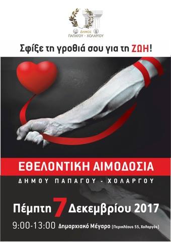 Στο πλαίσιο της κοινωνικής του αλληλεγγύης και ευαισθητοποίησης και με σύνθημα «Σφίξε τη γροθιά σου για τη ζωή», ο Δήμος Παπάγου-Χολαργού καλεί όλους τους κατοίκους και φορείς Χολαργού και Παπάγου σε μία ακόμη εθελοντική αιμοδοσία, την Πέμπτη 7 Δεκεμβρίου 2017, από τις 9.00 το πρωί έως τη 1.00 μετά το μεσημέρι, στην αίθουσα του Δημοτικού Συμβουλίου του Δημαρχιακού Μεγάρου Χολαργού (Περικλέους 55), προκειμένου να ενισχυθεί η δημοτική τράπεζα αίματος.