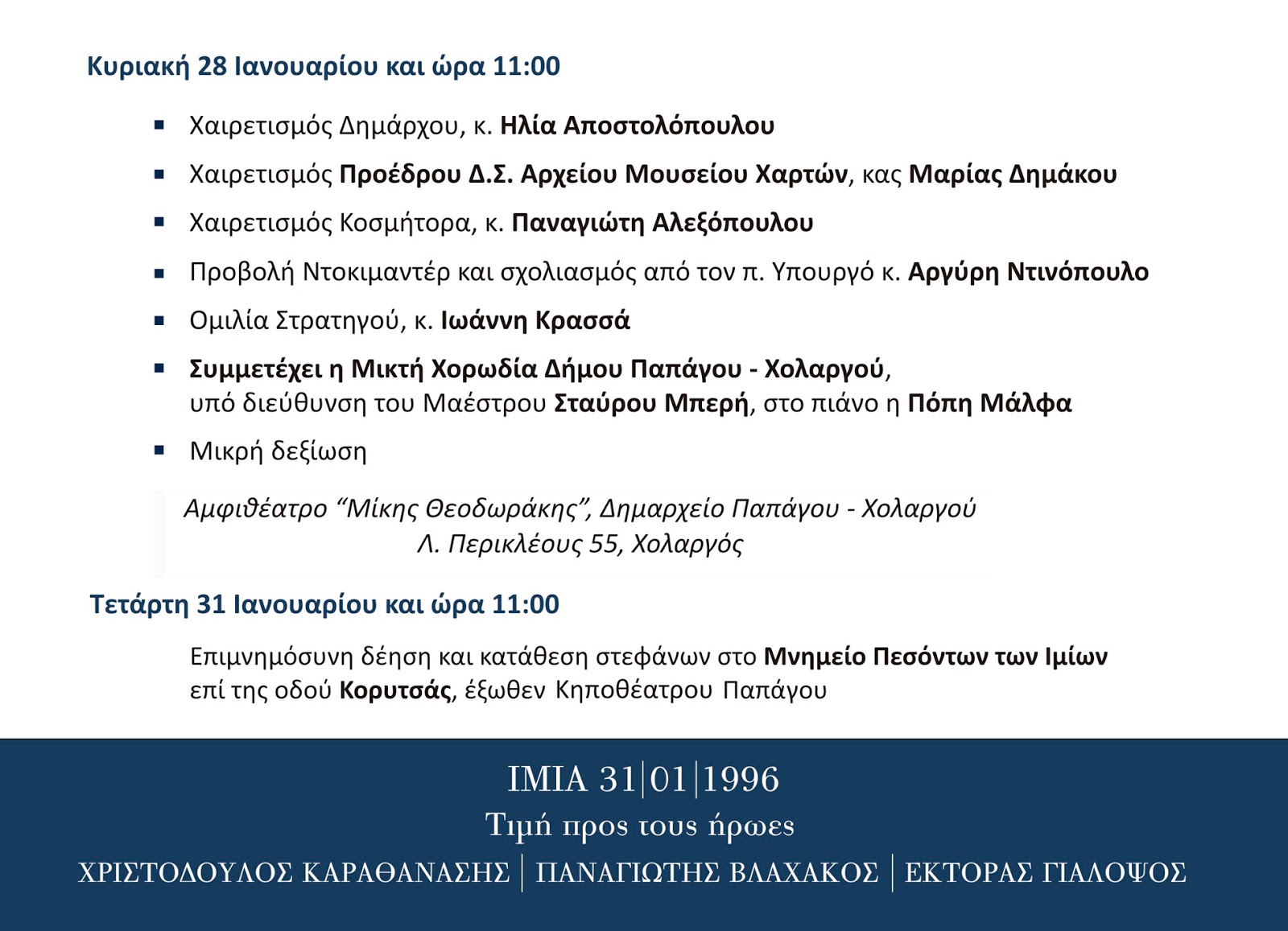 Ο Δήμαρχος Παπάγου-Χολαργού, Ηλίας Αποστολόπουλος και η Πρόεδρος της Δημοτικής Κοινότητας Παπάγου και επικεφαλής του Αρχείου-Μουσείου Παλαιών Χαρτών και Χαρακτικών Αττικής, Μαρία Δημάκου, σας προσκαλούν στις εκδηλώσεις μνήμης και τιμής προς τους πεσόντες στα Ίμια το 1996.