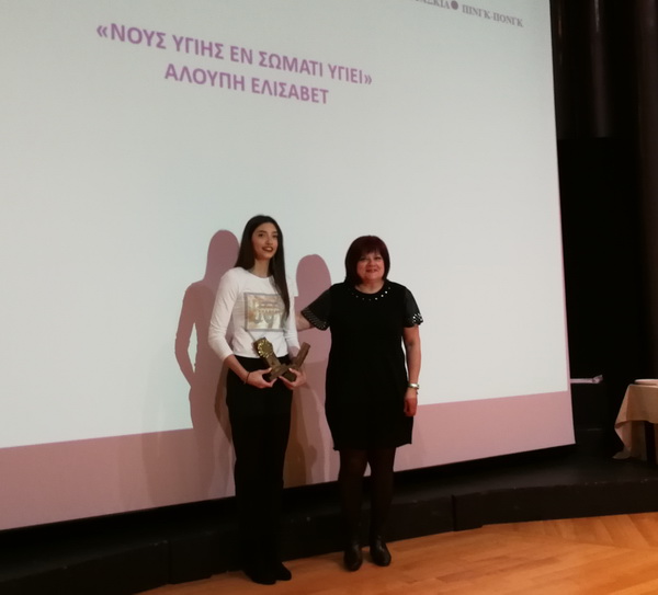 Το βραβείο «ΝΟΥΣ ΥΓΙΗΣ ΕΝ ΣΩΜΑΤΙ ΥΓΙΕΙ» απονεμήθηκε φέτος στην αθλήτρια Αλούπη Ελισάβετ, για την Ευρωπαϊκή της διάκριση στον αθλητισμό και ταυτόχρονα για το μαθητικό αριστείο που έλαβε από το σχολείο της.