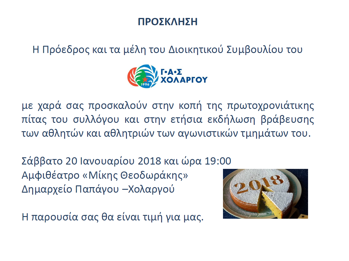 Η Πρόεδρος και τα μέλη του Διοικητικού Συμβουλίου του Γυμναστικού Αθλητικού Συλλόγου Χολαργού με χαρά σας προσκαλούν στην κοπή της πρωτοχρονιάτικης πίτας του συλλόγου και στην ετήσια εκδήλωση βράβευσης των αθλητών και αθλητριών των αγωνιστικών τμημάτων του.