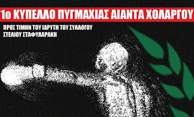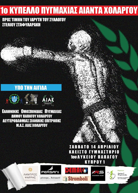 Το 1ο Κύπελλο Πυγμαχίας του Αίαντα Χολαργού θα φιλοξενηθεί στο κλειστό γυμναστήριο του Γυμνασίου-Λυκείου Παπάγου (Κύπρου 1), το Σάββατο 14 Απριλίου 2018 (17:00). Οι αγώνες θα είναι αφιερωμένοι στη μνήμη του πρώτου δασκάλου πυγμαχίας στο Χολαργό και ιδρυτή του Αίαντα, Στέλιου Σταφυλαράκη.