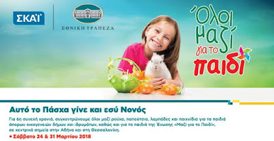 Η Εθνική Τράπεζα και ο ΣΚΑΪ, στο πλαίσιο της πρωτοβουλίας «Όλοι μαζί για το παιδί», διοργανώνουν για 6η συνεχή χρονιά σειρά εκδηλώσεων σε Αθήνα και Θεσσαλονίκη, με τίτλο «Αυτό το Πάσχα γίνε και εσύ νονός», το Σάββατο 24 και το Σάββατο 31 Μαρτίου 2018.