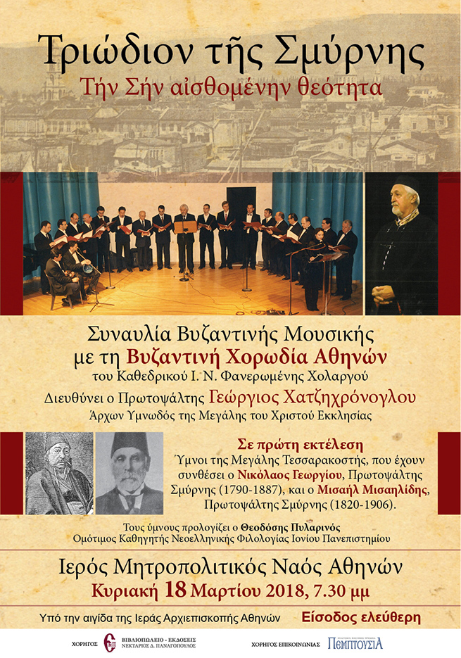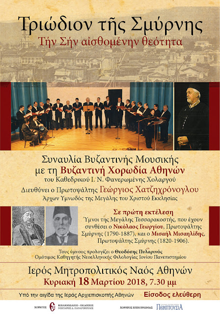 Μια μεγάλη συναυλία με τίτλο «Τριώδιον της Σμύρνης» (Την Σην αισθομένην θεότητα) θα δώσει η Βυζαντινή Χορωδία Αθηνών του Καθεδρικού Ιερού Ναού Παναγίας Φανερωμένης Χολαργού, υπό τη διεύθυνση του Πρωτοψάλτη του Ναού και Άρχοντα Υμνωδού, Γεώργιου Χατζηχρόνογλου, στον Ιερό Μητροπολιτικό Ναό Αθηνών, την Κυριακή 18 Μαρτίου 2018, στις 19:30.