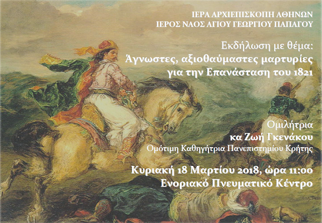 Την Κυριακή 18 Μαρτίου 2018 και ώρα 11.00 π.μ., στο Ενοριακό Πνευματικό Κέντρο του Ιερού Ναού Αγίου Γεωργίου Παπάγου, θα πραγματοποιηθεί εκδήλωση-ομιλία εν όψει του εορτασμού της 25ης Μαρτίου, με θέμα «Άγνωστες, Αξιοθαύμαστες μαρτυρίες για την Επανάσταση του 1821» και ομιλήτρια την Ομότιμη Καθηγήτρια του Πανεπιστημίου Κρήτης, Ζωή Γκενάκου.