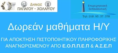 Δόθηκαν τα πρώτα πτυχία και συνεχίζονται κανονικά τα μαθήματα πληροφορικής από το Δήμο Παπάγου-Χολαργού, σε συνεργασία με τον πιστοποιημένο Οργανισμό από το Υπουργείο Παιδείας, «Επιχειρησιακή Εκπαιδευτική ΕΠΕ», για κατοίκους Χολαργού και Παπάγου.