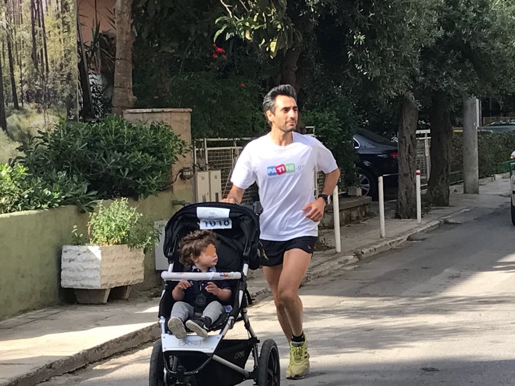 Πρώτος τερμάτισε ο Δημήτρης Καλιακούδης, ο οποίος σε όλη τη διαδρομή των 5 χιλιομέτρων έτρεχε με το παιδάκι του στο καρότσι.