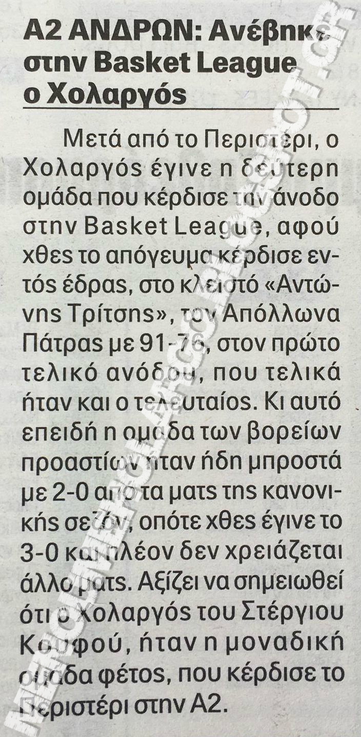 Διαβάστε αναλυτικά όλα όσα γράφουν οι αθλητικές εφημερίδες και ιστοσελίδες για τον ιστορικό άθλο της ΑΕ Χολαργού και την παρθενική άνοδο στην Α1 | Να ‘χαμε να λέγαμε, να ‘χαμε να πούμε, η… αυγολέμονη ένσταση του κατά τ’ άλλα ιστορικού Απόλλωνα Πάτρας και σκληρή προσωπική απάντηση από τον διοικητικό ηγέτη της ΑΕΧ, Γιώργο Δρόσο