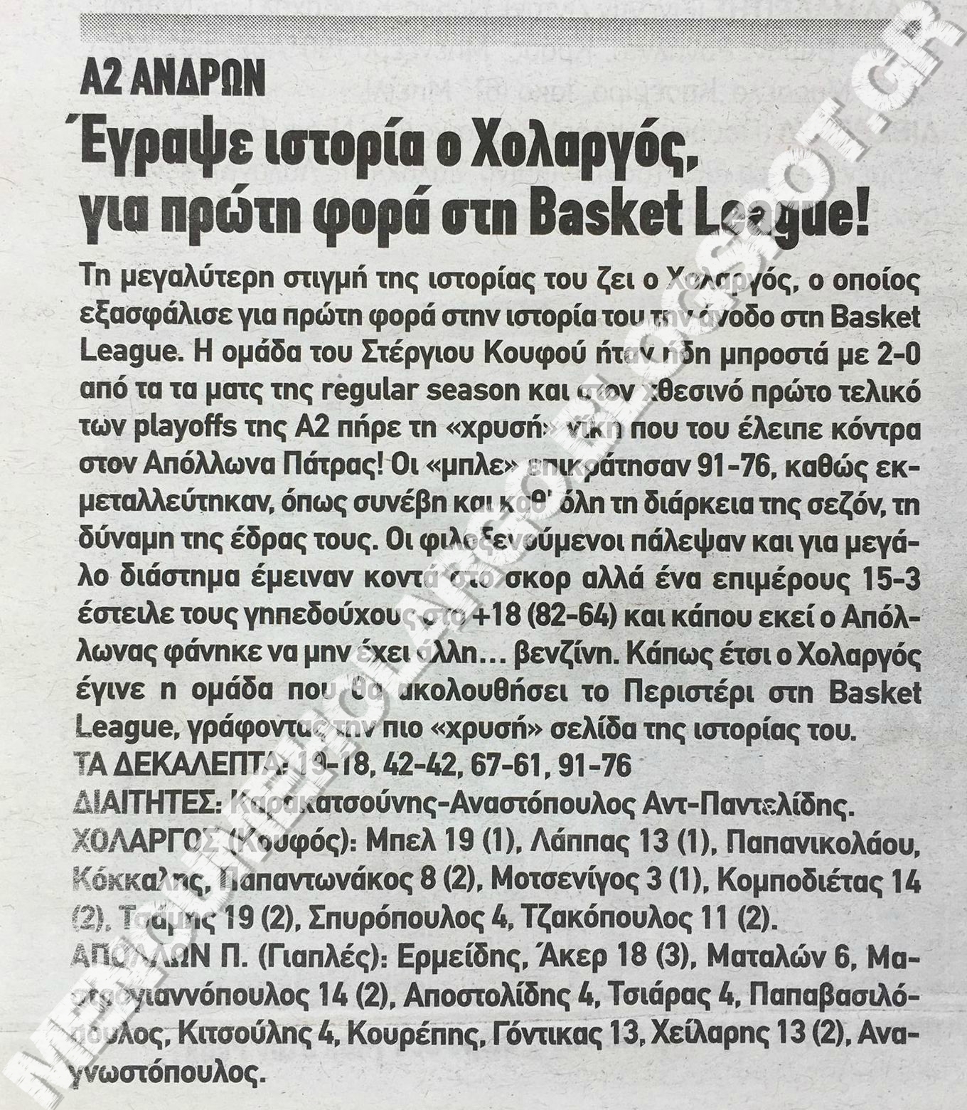 Σας εύχομαι καλή επιτυχία στο επόμενο πρωτάθλημα της Α2. Ευτυχώς για εσάς, ο ΧΟΛΑΡΓΟΣ θα αγωνίζεται στη Basket League!».