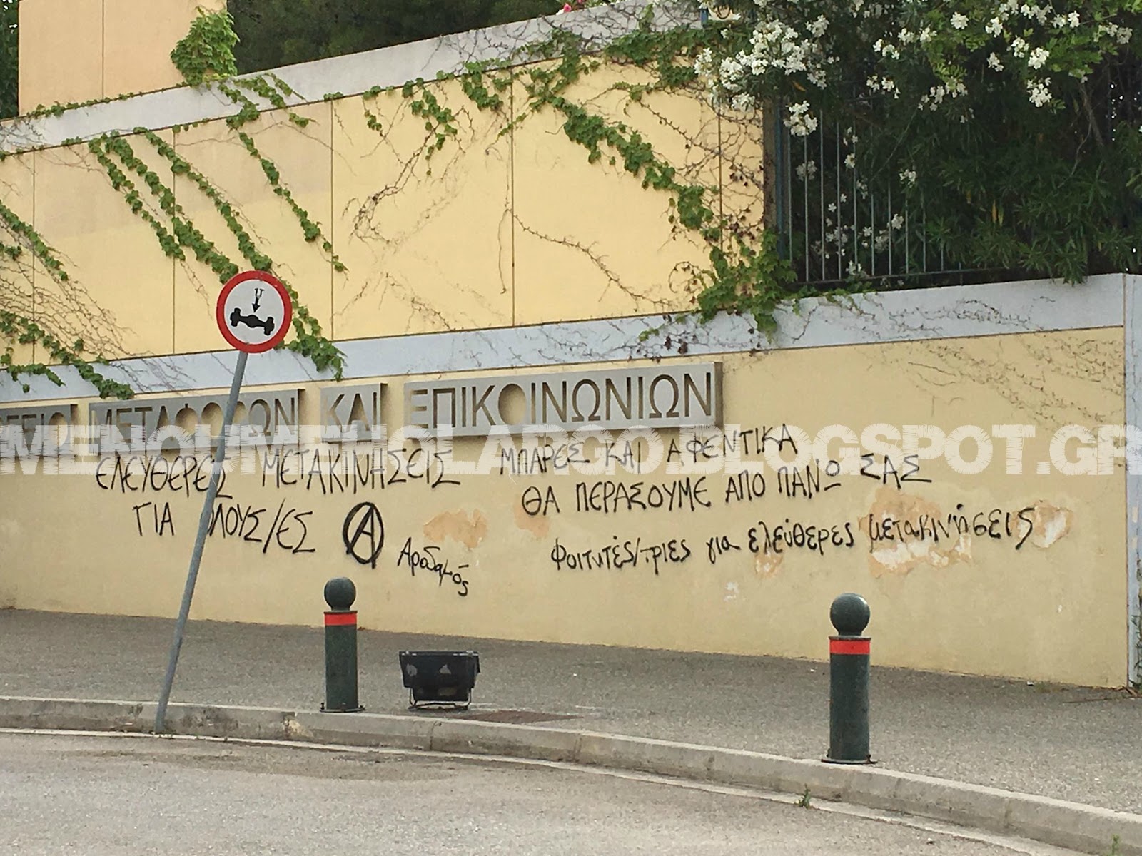 Και ενώ ο… τραγέλαφος με τις μπάρες στους σταθμούς του Μετρό συνεχίζεται, γκράφιτι σχετικού περιεχομένου έκαναν πρόσφατα την εμφάνισή τους στην πρόσοψη της εισόδου του Υπουργείου Μεταφορών στο Χολαργό. Η εικόνα, μιλάει από μόνη της…