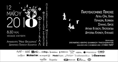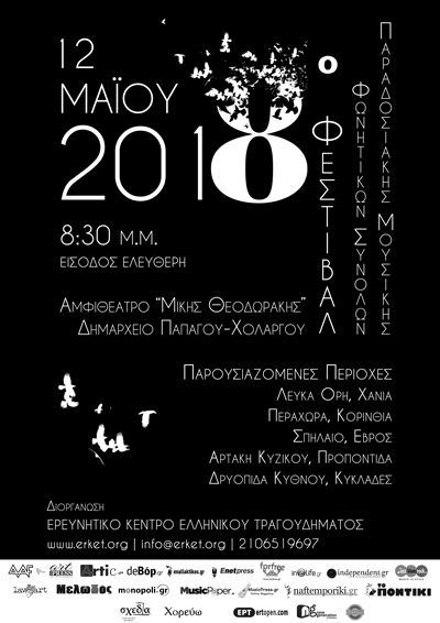 Το Ερευνητικό Κέντρο Ελληνικού Τραγουδήματος (ΕΡΚΕΤ) διοργανώνει το 8ο Φεστιβάλ Φωνητικών Συνόλων Παραδοσιακής Μουσικής, το Σάββατο 12 Μαΐου 2018, στο Αμφιθέατρο «Μίκης Θεοδωράκης» του Δημαρχιακού Μεγάρου Χολαργού.