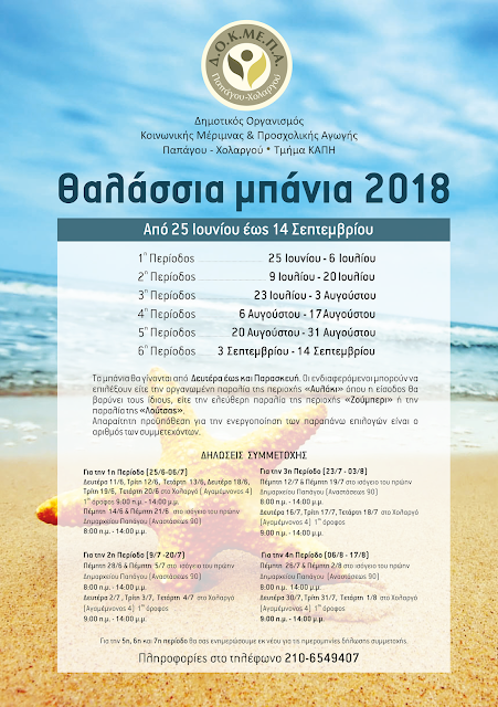 Σύμφωνα με το ετήσιο πρόγραμμα έτους 2018, το τμήμα ΚΑΠΗ του Δημοτικού Οργανισμού Κοινωνικής Μέριμνας & Προσχολικής Αγωγής (ΔΟΚΜΕΠΑ) Παπάγου-Χολαργού θα πραγματοποιήσει τα θαλάσσια μπάνια που απευθύνονται στα μέλη του, στους συνοδούς και τις οικογένειές τους, οι οποίοι είναι δημότες ή κάτοικοι του Δήμου Παπάγου-Χολαργού.