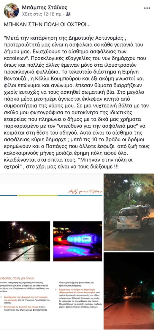 Ως τραγική ειρωνεία, μία μόλις ημέρα νωρίτερα (16/8), ο Μπάμπης Στάικος μέσω ανάρτησής του στο προσωπικό του προφίλ στο Facebook είχε καυτηριάσει τη διοίκηση Αποστολόπουλου για το ανεπαρκές αίσθημα ασφάλειας στις γειτονιές του Δήμου, καταγγέλλοντας μάλιστα πως οι οδηγοί της ιδιωτικής εταιρείας στην οποία ο Δήμος Παπάγου-Χολαργού έχει αναθέσει τις νυχτερινές περιπολίες, αντί να κάνουν τη δουλειά τους, το ρίχνουν στον… ύπνο!
